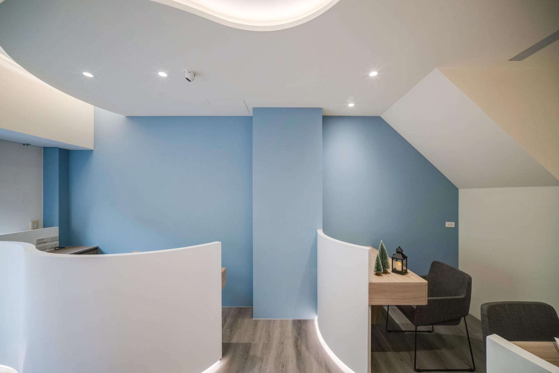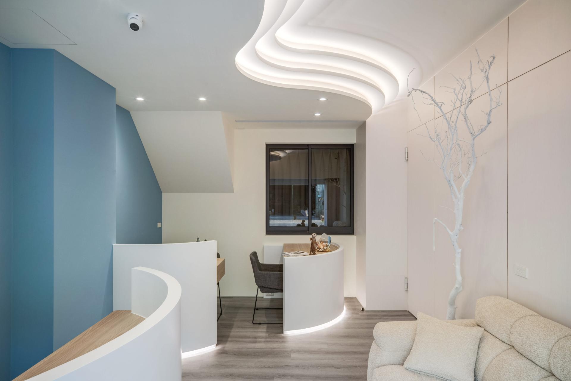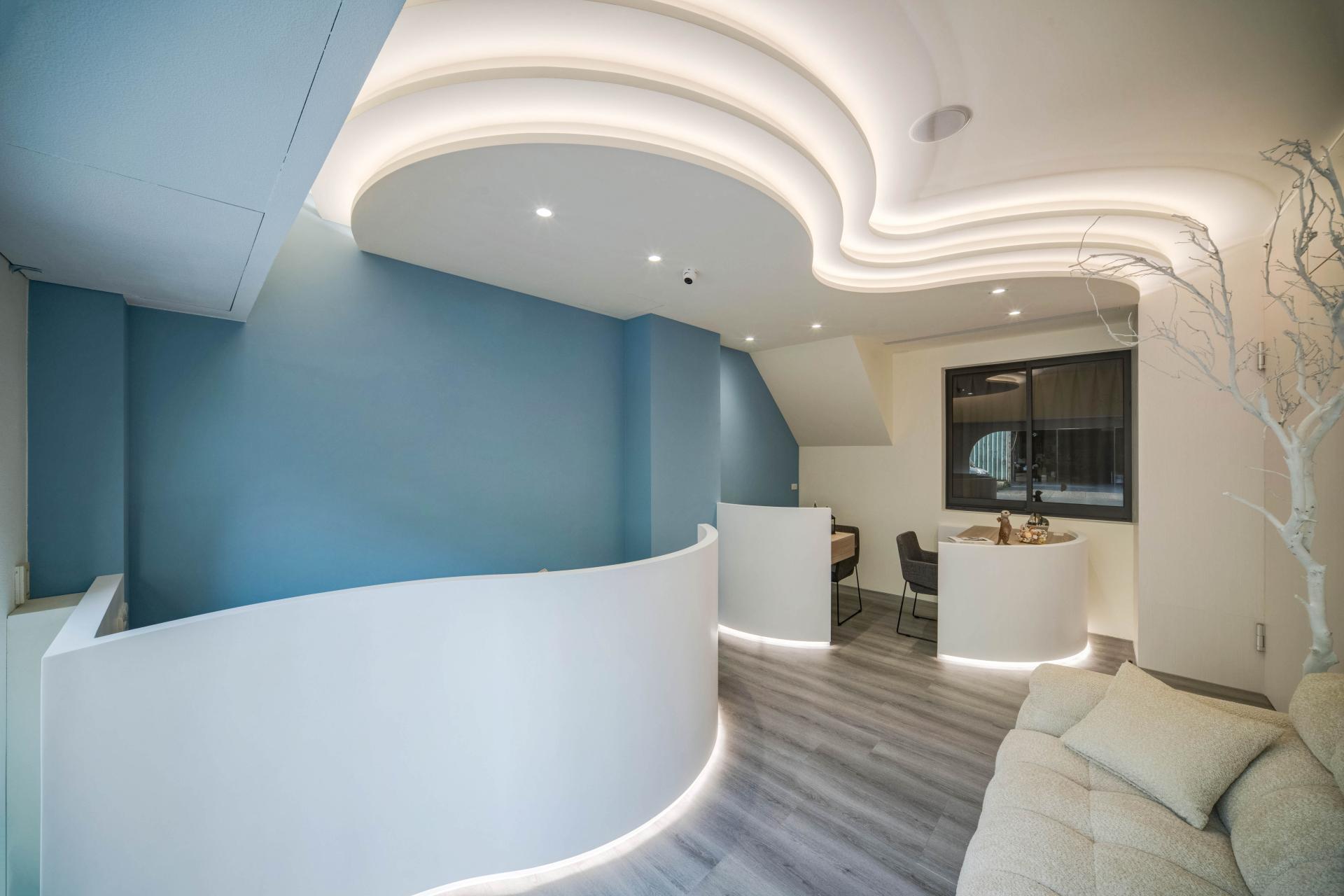 The first-floor reception area boasts an inviting blend of light blue, white, and natural wood elements, carefully curated to cultivate a fresh and professional brand image. As you enter, the gracefully curved ceilings and low walls, complemented by soft, indirect lighting, immediately soften the overall appearance, creating a light and comfortable atmosphere. Nestled within this inviting space, the treatment area is thoughtfully enclosed by elegant curved partitions that not only enhance privacy but also elevate customer comfort. Transitioning to the upper residential area, one will notice that the design language continues seamlessly; the gentle curves are paired with natural elements and earthy color tones, fostering a warm and cozy living environment that beckons relaxation. Moreover, the kitchen is accentuated by sophisticated glass sliding doors, strategically designed to minimize the spread of cooking odors, ensuring a pleasant ambiance throughout the home. Overall, this thoughtfully designed space harmoniously balances aesthetics and functionality, creating a truly welcoming experience.