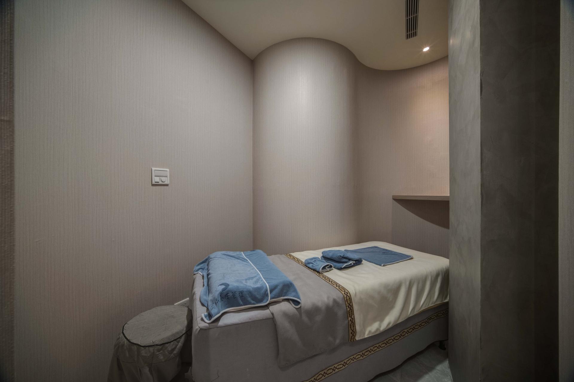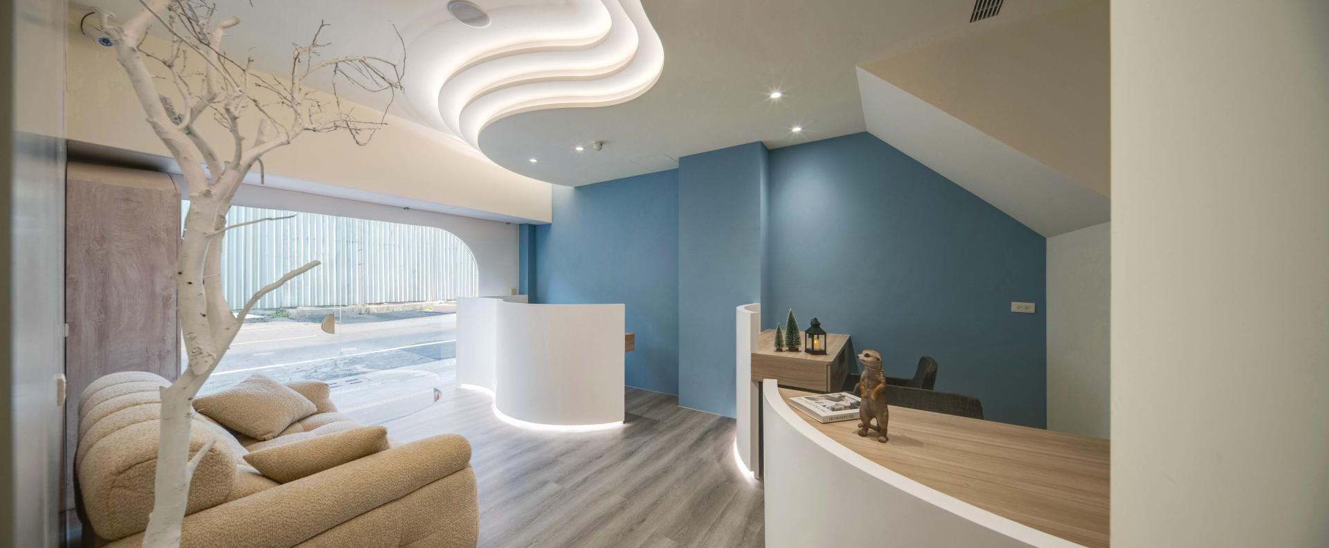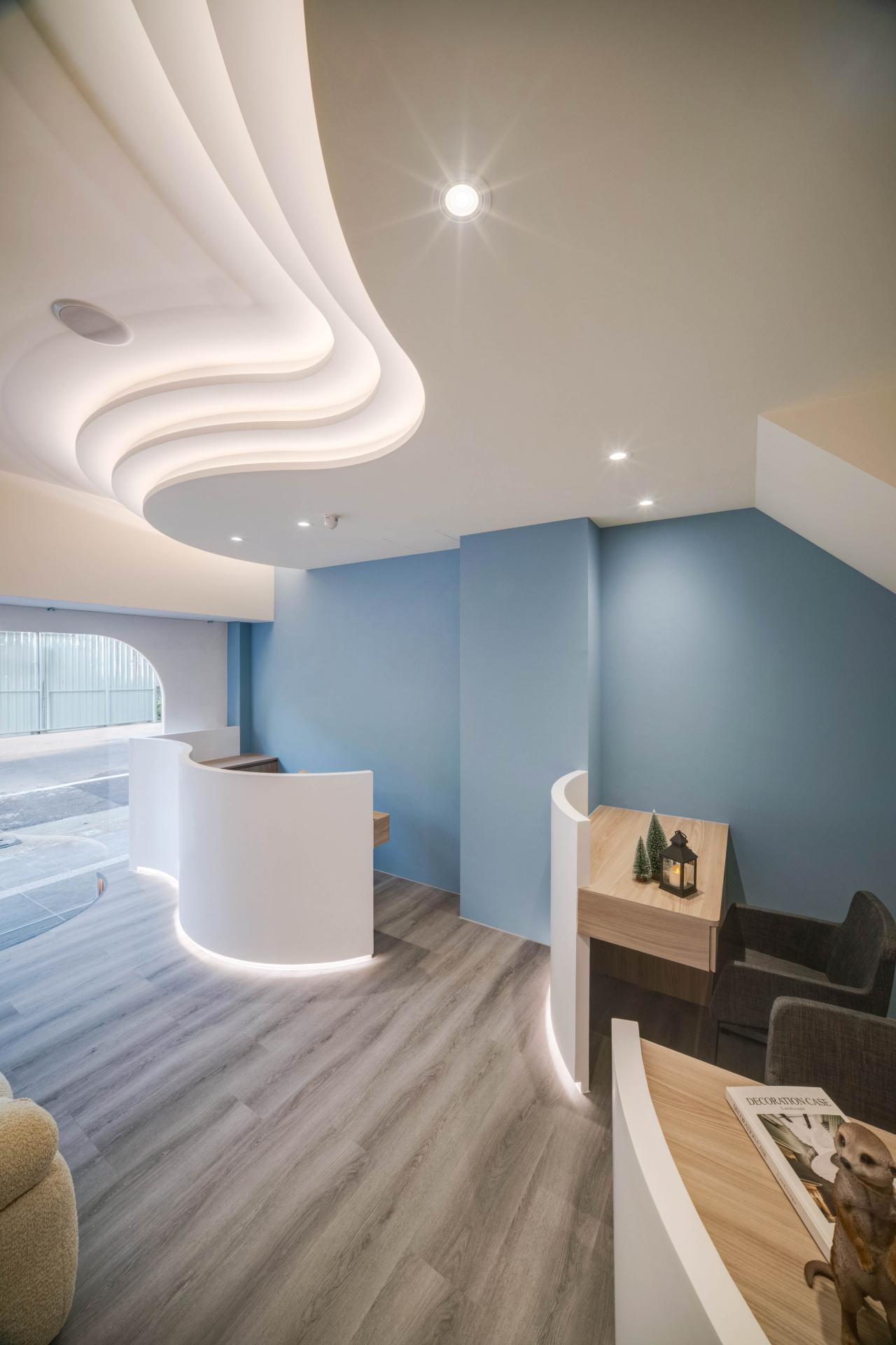 The first-floor reception area boasts an inviting blend of light blue, white, and natural wood elements, carefully curated to cultivate a fresh and professional brand image. As you enter, the gracefully curved ceilings and low walls, complemented by soft, indirect lighting, immediately soften the overall appearance, creating a light and comfortable atmosphere. Nestled within this inviting space, the treatment area is thoughtfully enclosed by elegant curved partitions that not only enhance privacy but also elevate customer comfort. Transitioning to the upper residential area, one will notice that the design language continues seamlessly; the gentle curves are paired with natural elements and earthy color tones, fostering a warm and cozy living environment that beckons relaxation. Moreover, the kitchen is accentuated by sophisticated glass sliding doors, strategically designed to minimize the spread of cooking odors, ensuring a pleasant ambiance throughout the home. Overall, this thoughtfully designed space harmoniously balances aesthetics and functionality, creating a truly welcoming experience.