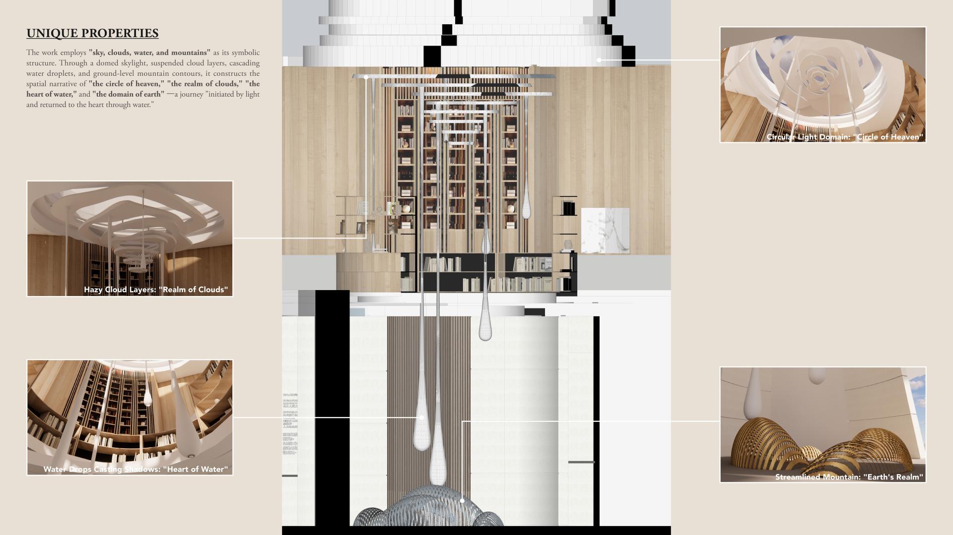 Drawing inspiration from Eastern philosophy, the design team conducted multiple tests on light, humidity, and acoustics, translating the four natural elements—sky, cloud, water, and mountain—into a perceivable spatial expression.