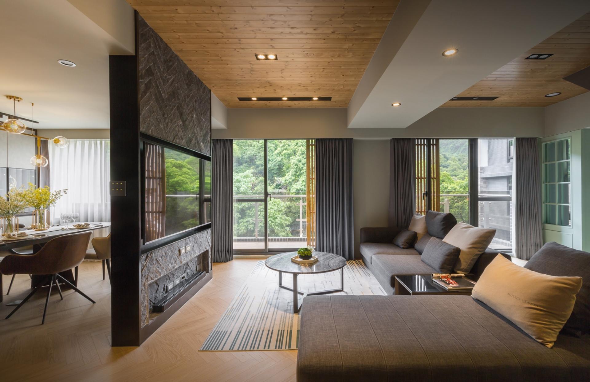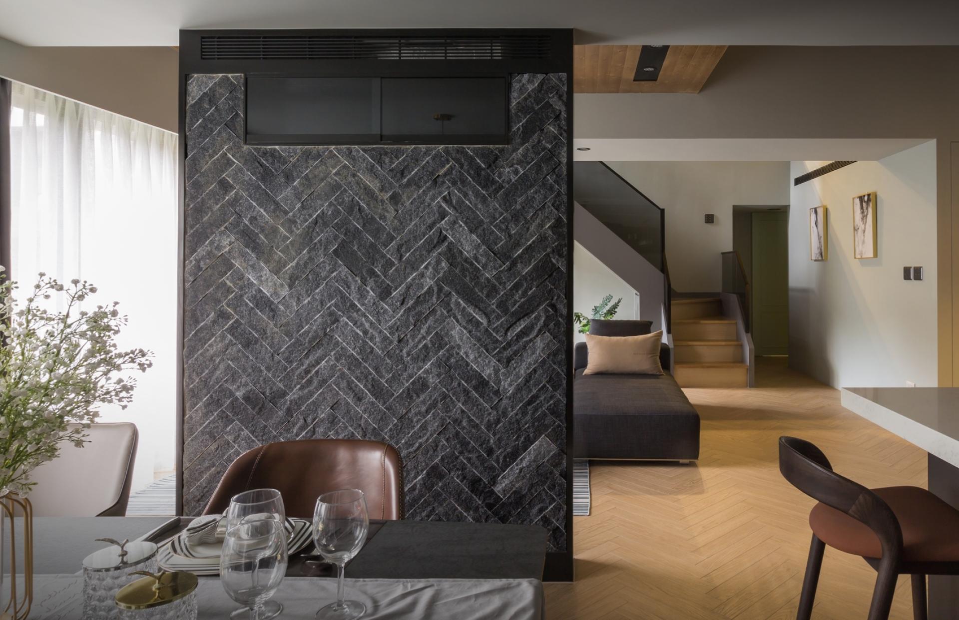 In line with the owner's preferences, the designer artfully merged the clean lines and simplicity of Scandinavian style with the raw, edgy appeal of modern industrial design to craft a home exuding a vintage and elegant ambiance. Throughout the space, a harmonious blend of soft gray tones and natural wood grains provides a soothing backdrop, while accents of Morandi green inject a refreshing touch. Amidst the home's shared spaces, such as the living and dining areas, the high-ceilinged entrance hall and slender TV wall enable seamless light and air circulation, fostering an open and radiant environment.