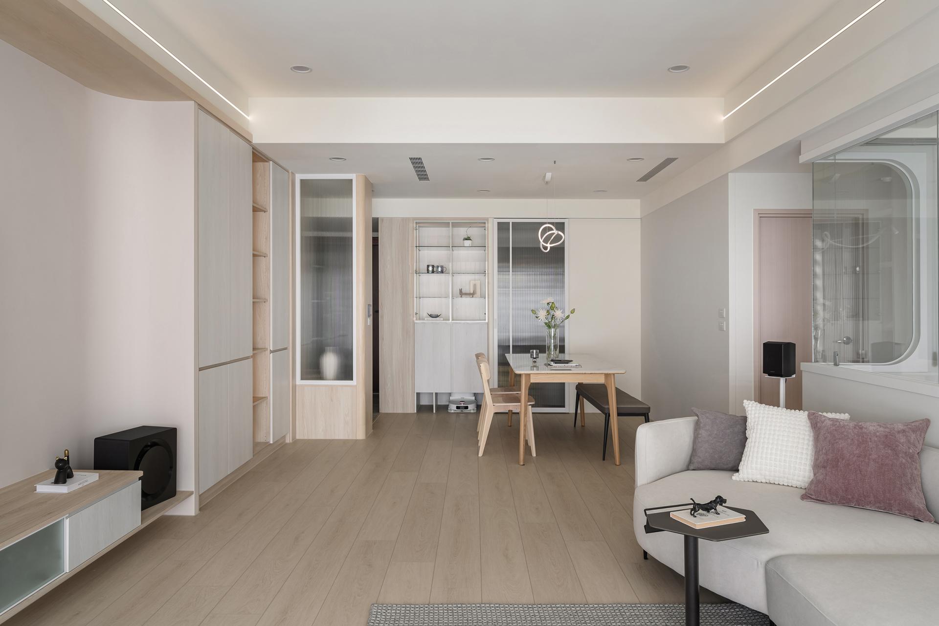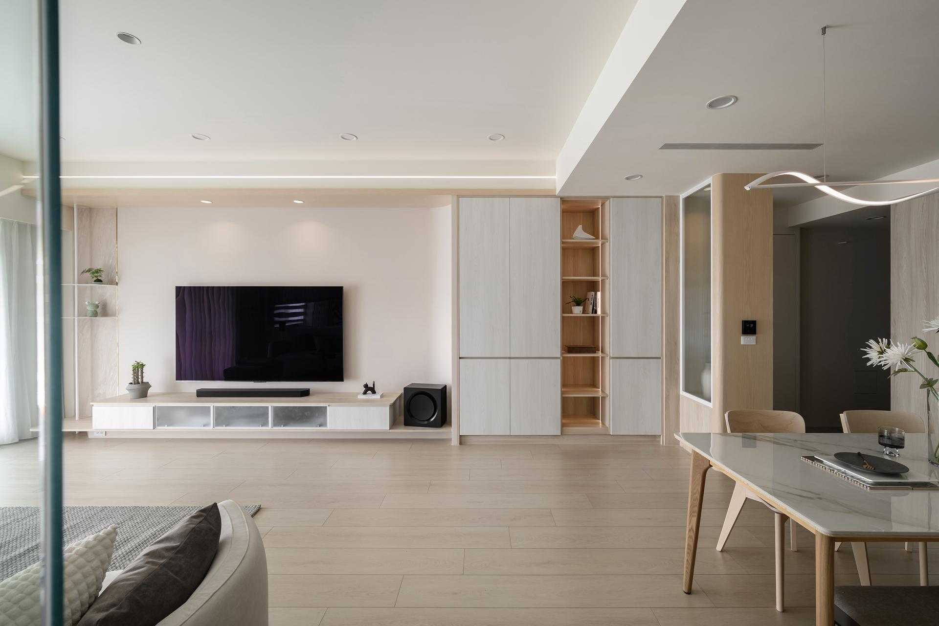 2. Warm and Inviting: The social area is rendered in light tones to evoke a sense of openness, with selective use of titanium accents that introduce a subtle touch of elegant sheen. Linear lighting fixtures outline the modern, minimalist style, resonating with the owner's desire for a warm and welcoming home atmosphere. Meanwhile, the TV wall incorporates soft peach-orange hues alongside wooden elements, creating a natural, unpretentious yet refined spatial expression.