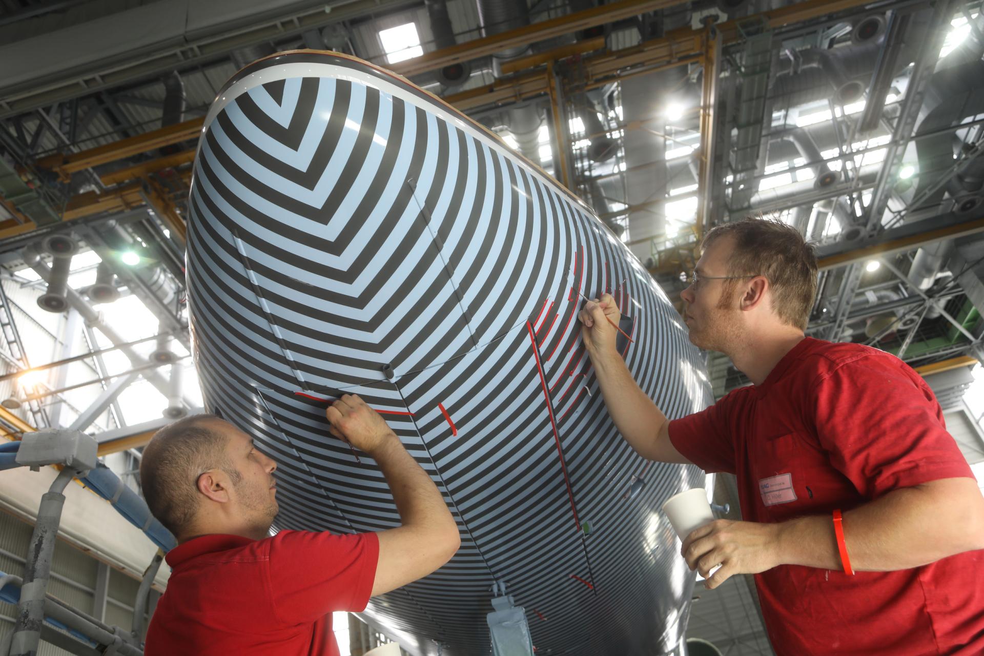 The process of painting the aircraft took ten painters two weeks to complete, with the entire project demanding 2,300 working hours, 20 painters and more than 2.4 kilometres of tape.